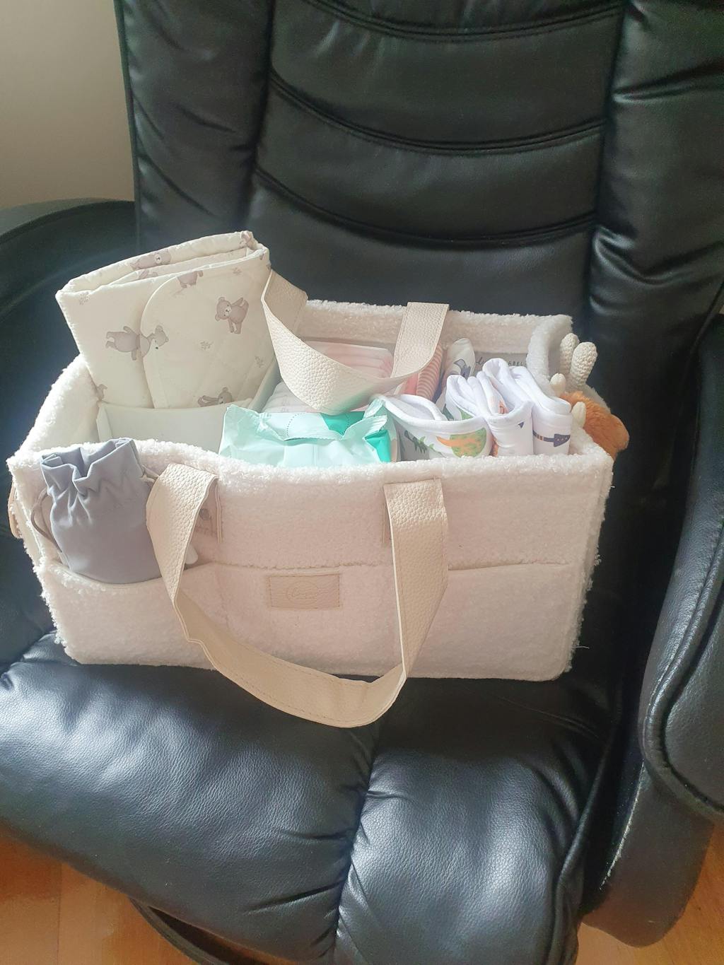 Our Caddie features premium vegan leather trims, nine pockets and four removable dividers for easy organisation of nappies, wipes, creams, and more. It's effortlessly portable with two handles, making it perfect for moving around the home or keeping in the car for on-the-go essentials like spare clothes and toys and diapers